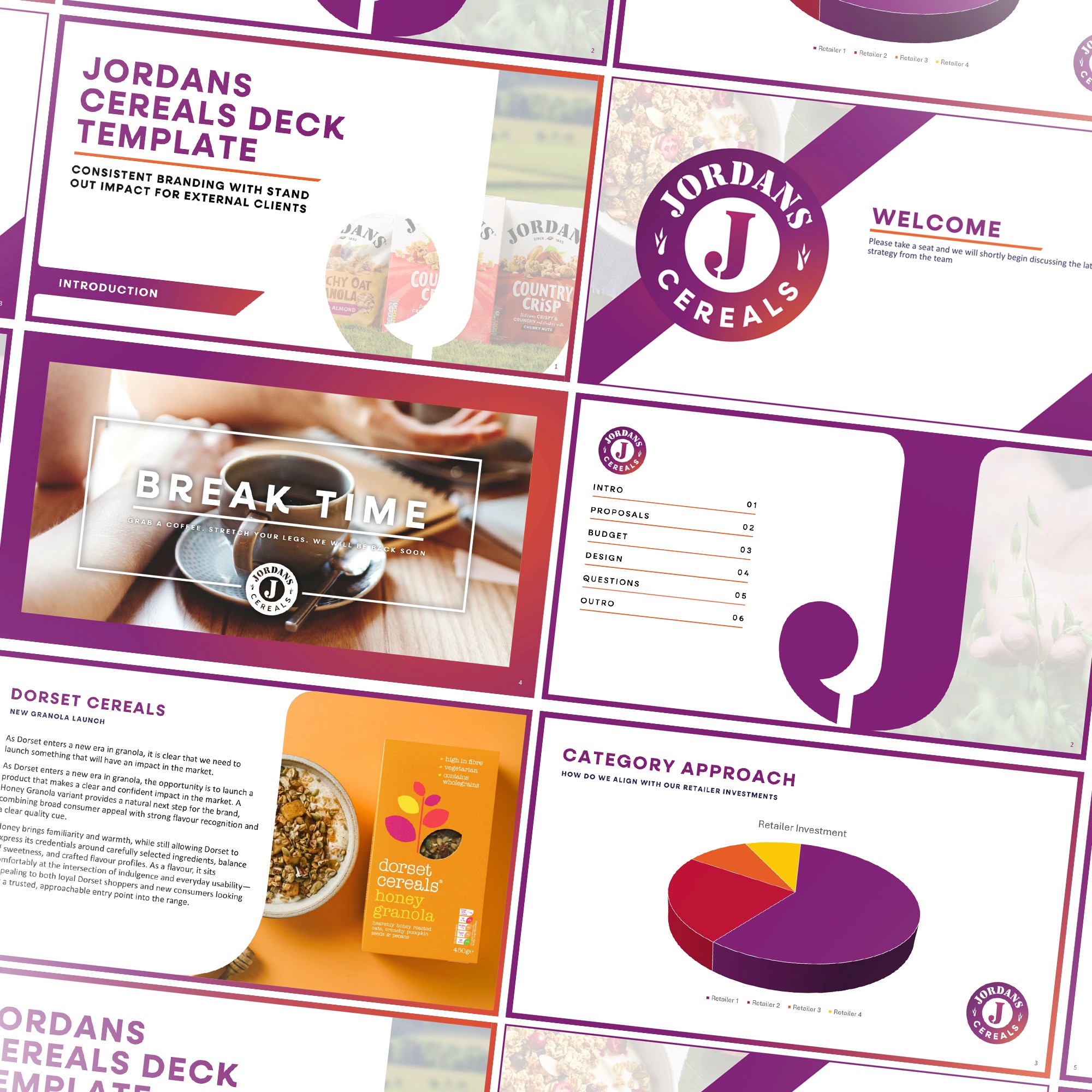 In just a month of work to speed up a quick corporate transition, we went from a funcitonal logo with no supporting identity, to a completely distinctive rebrand with colours, fonts and key assets that embody the new horizon and direction that Jordans Cereals as a business has begun. Everything from signage to internal comms can easily be created from the new assets and guidelines.